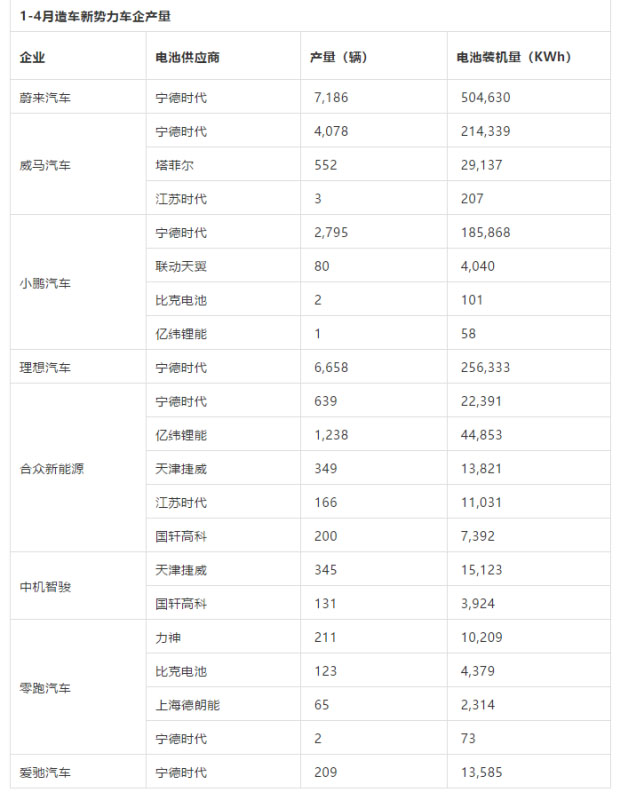 為此,高工鋰電梳理了2020年1-4月新勢(shì)力車企產(chǎn)量及配套情況,主要呈現(xiàn)以下幾個(gè)特點(diǎn):