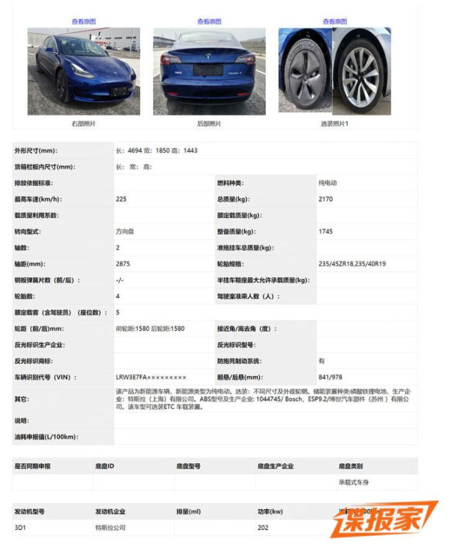 從申報(bào)圖來(lái)看,特斯拉Model 3的外觀并未發(fā)生變化;申報(bào)信息一欄中,車(chē)身長(zhǎng)寬高尺寸分別為4694mm/1850mm/1443mm,軸距為2875mm,新車(chē)電動(dòng)機(jī)型號(hào)為3D1,最大功率為202kW,均與現(xiàn)款車(chē)型保持一致。
