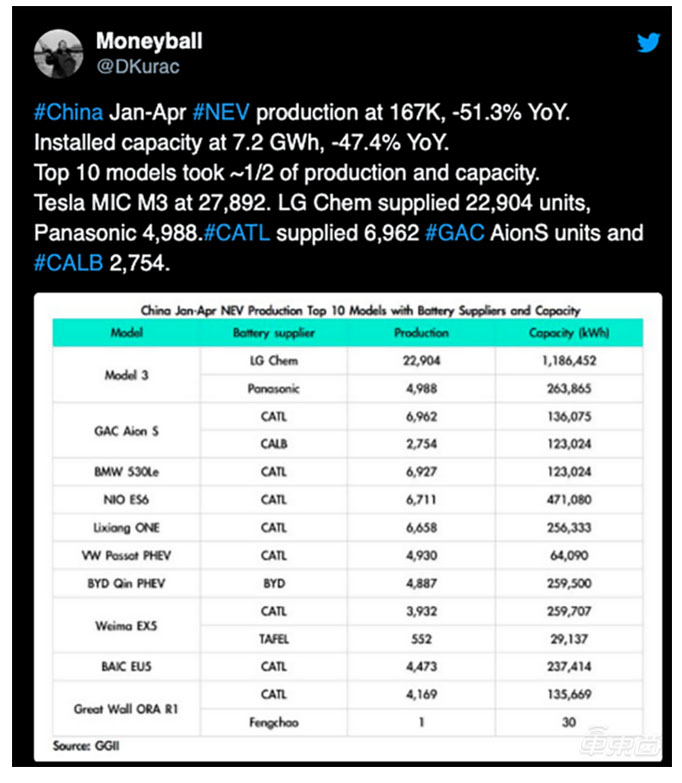 根據(jù)數(shù)據(jù)顯示,LG化學(xué)和松下都在為國(guó)產(chǎn)特斯拉進(jìn)行電池的供應(yīng),在今年的前四個(gè)月中,LG化學(xué)和松下為特斯拉提供了1.45GWh的動(dòng)力電池。