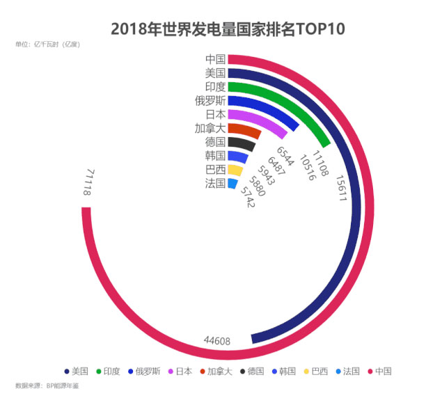 但到了2018年,中國發(fā)電量高達7萬億千瓦時,位列全球第一,十六年間增長近10倍。位列第二的是美國,發(fā)電量為4.46萬億千瓦時,僅增長約1.4萬億千瓦時。