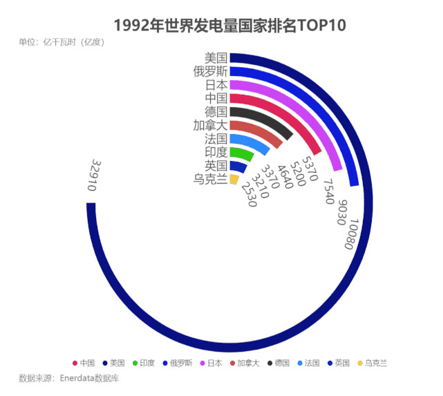以1992年為例,當(dāng)年中國發(fā)電量僅為7540億千瓦時,位列世界第四,僅為美國30750億千瓦時的四分之一。
