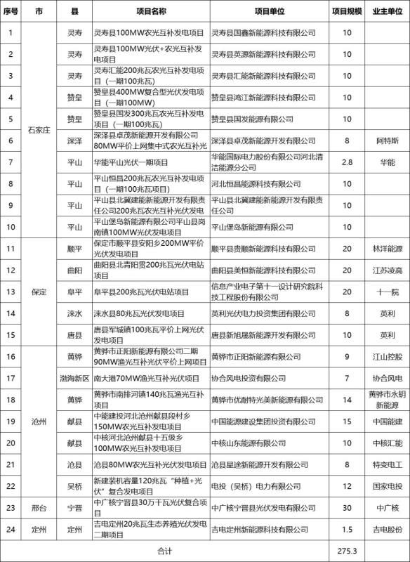 5月15日,河北發(fā)改委公示2020年平價(jià)光伏發(fā)電項(xiàng)目擬安排情況,共有24個(gè)項(xiàng)目,共計(jì)275.3萬(wàn)千瓦進(jìn)入該名單。