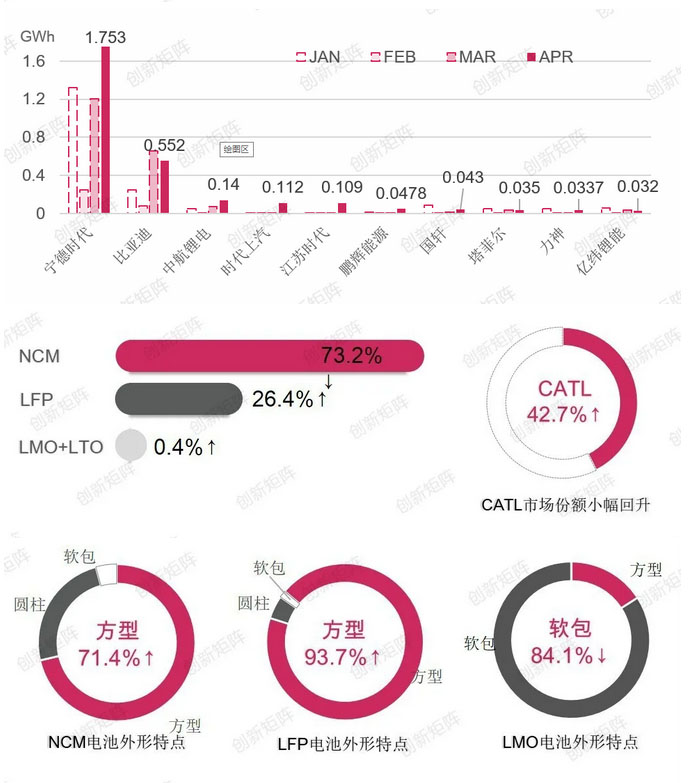 同期,LFP體系產(chǎn)品市場(chǎng)份額繼續(xù)擴(kuò)大,4月累計(jì)裝機(jī)量0.955GWh,占比回升至26.5%↑。