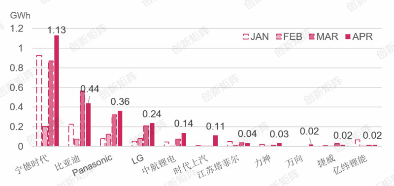 2020年4月動(dòng)力電池裝機(jī)量為 3.61GWh,環(huán)比增長(zhǎng)30.3%,各企業(yè)生產(chǎn)逐漸恢復(fù);受市場(chǎng)環(huán)境影響,4月裝機(jī)量同比下降33.3%,但相較2、3月份有明顯好轉(zhuǎn)。