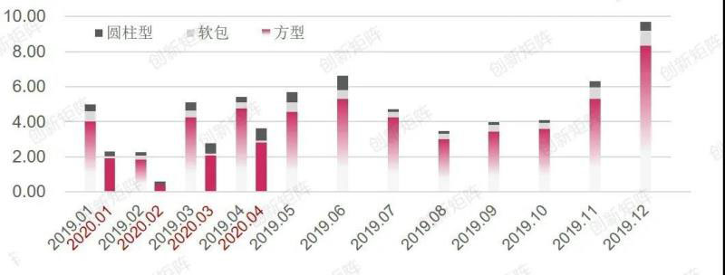 軟包產(chǎn)品市場(chǎng)占比顯著扭轉(zhuǎn),4月軟裝機(jī)量0.136GWh,與上月基本持平,占比3.8%↓。