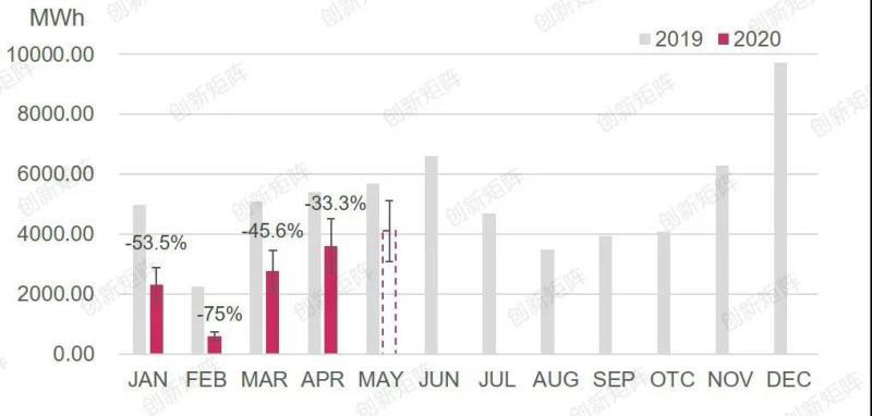 預(yù)計(jì)5月隨著疫情結(jié)束和市場(chǎng)回暖,裝機(jī)量有望超過(guò)4GWh,環(huán)比降幅減小至30%以內(nèi)。
