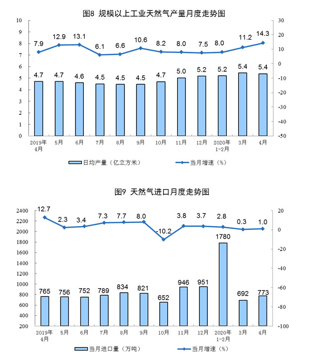 天然氣進口小幅增長。4月份,進口天然氣773萬噸,同比增長1.0%。1—4月份,進口天然氣3233萬噸,同比增長1.5%。