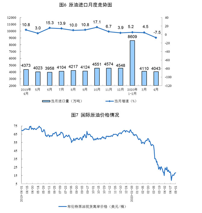 原油進口下降,國際原油價格低位震蕩。4月份,進口原油4043萬噸,同比下降7.5%。1—4月份,進口原油16761萬噸,同比增長1.7%。4月30日布倫特原油現(xiàn)貨離岸價格為18.11美元/桶,比3月31日的14.85美元/桶上漲22.0%。