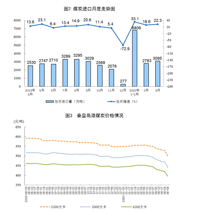 煤炭進口增長較快,交易價格有所下跌。4月份,進口煤炭3095萬噸,同比增長22.3%;1—4月份,進口煤炭1.3億噸,同比增長26.9%。港口煤炭綜合交易價格繼續(xù)下跌,5月8日秦皇島港5500、5000和4500大卡煤炭價格分別為每噸501元、442元和396元,比4月3日分別下跌39元、41元和36元。