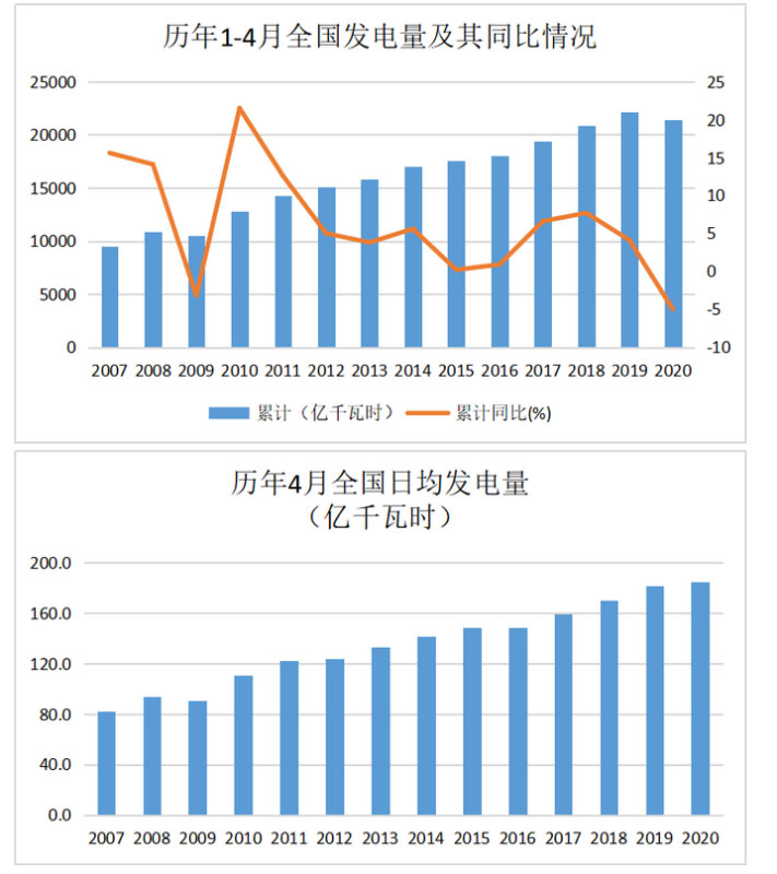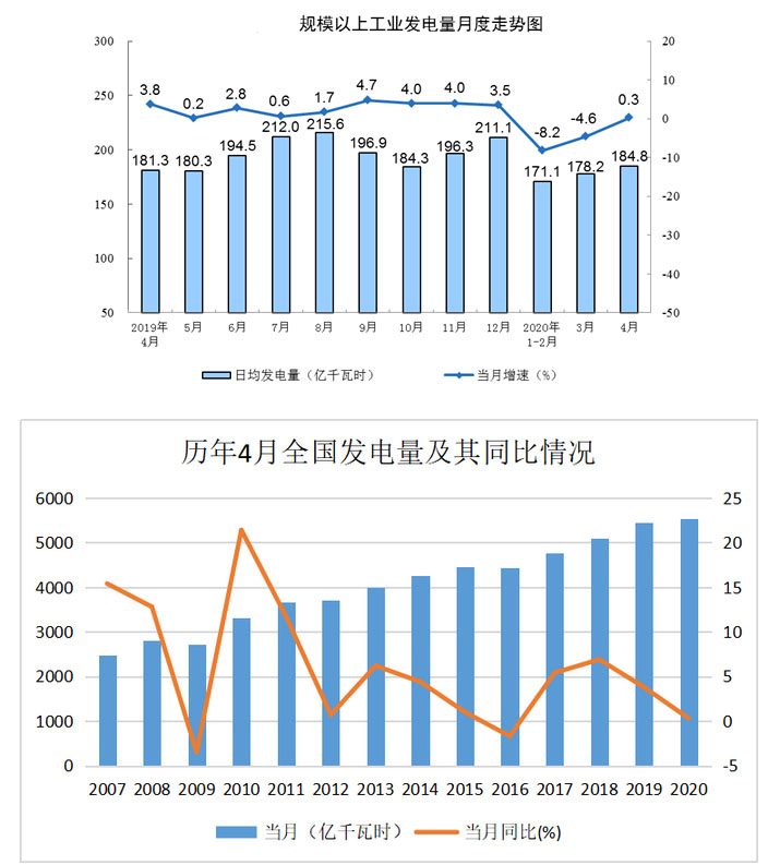 電力生產(chǎn)由降轉(zhuǎn)增。今年4月份,全國發(fā)電量達5543億千瓦時,同比增長0.3%,上月為下降4.6%,日均發(fā)電量184.8億千瓦時,環(huán)比增加6.6億千瓦時。1-4月份,發(fā)電量21388億千瓦時,同比下降5.0%。