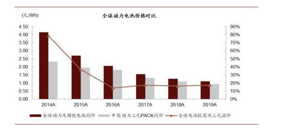 全球電池均價較國內三元溢價區(qū)間穩(wěn)定,國內動力電池價格快速下降拉動全球動力電池價格中樞下行。中國2019年與1Q20動力電池價格下降較大,其中三元動力電池組1Q20行業(yè)均價環(huán)比下降7.4%,同比降幅高達24.3%。動力電池產業(yè)鏈持續(xù)全球化下,全球動力與儲能電池價格較國內三元的溢價也于2016年后穩(wěn)定于15-20%區(qū)間(全球均價包含中國價格),我們認為中國當前的價格快速下降也對全球動力電池價格形成一定沖擊,進一步帶動全球動力與儲能電池價格中樞下降。