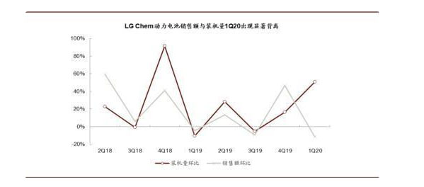 圖表: LG Chem動力電池1Q20銷售額與裝機量趨勢顯著背離