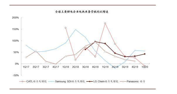 LG Chem與三星SDI展望2Q20營收同比持平或增長,LG Chem略下調全年電池業(yè)務營收預期。LG Chem預期2Q20電池業(yè)務將環(huán)比增長20%,受益于1)新EV車型的推出,2)儲能業(yè)務持續(xù)的環(huán)比向好,3)圓柱動力電池出貨量的持續(xù)增長(我們預期主要受益于特斯拉上海的放量),三星SDI則同樣預期2Q20電池業(yè)務環(huán)比增長,其中動力電池指引為環(huán)比持平,受益于PHEV的繼續(xù)放量;儲能業(yè)務受益于美國公共事業(yè)儲能需求的進一步增長;小型電池則受益于電動工具進入備貨的旺季。全年來看,LG Chem則表示將原預期為15兆億韓元的總電池業(yè)務營收下調10-15%。
