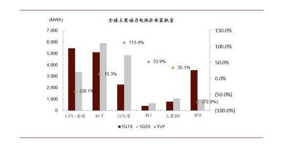 圖表: 1Q20全球動力電池裝機量約19.5GWh,同降10.9%,海外占主導