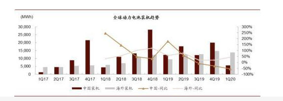 1Q20全球鋰電池測算總裝機量為19.5GWh,同降10.9%;其中中國裝機5.7GWh,同降54%,海外裝機13.8GWh,同增44%[1]。