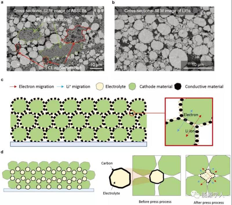 電極內(nèi)的電子電導(dǎo)率在提高ASSLBs容量和功率特性方面起著至關(guān)重要的作用。圖3a,b顯示了ASSLBs和傳統(tǒng)液體LIBs的電極橫截面SEM。可以看出,ASSLBs電極內(nèi)的導(dǎo)電材料(CMs)在某些地方嚴(yán)重聚集,而傳統(tǒng)LIBs電極的CMs具有良好的分散性。此外,由于SE和活性材料之間的高界面電阻,大多數(shù)ASSLBs電極都是用高比例的電解質(zhì)制成的,這些電解質(zhì)是電子絕緣體。因此,與傳統(tǒng)的液體LIBs相比,ASSLBs的電子電導(dǎo)率可能不夠。因此,即使提高電極的鋰離子電導(dǎo)率,ASSLBs也會(huì)由于缺乏電子通路而無(wú)法發(fā)揮真實(shí)容量。因此,研究提高電子電導(dǎo)率的改進(jìn)方法是非常重要的。