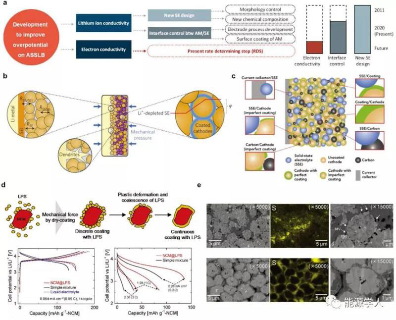 圖3. a)ASSLBs和b)常規(guī)液體LIBs的橫截面SEM;c)ASSLBs的合理電極示意圖;d)減少ASSLBs整體過(guò)電位的未來(lái)研究方向示意圖
