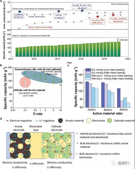 此外,如圖1b所示,傳統(tǒng)LIBs的電化學(xué)測(cè)試能夠以不同的倍率進(jìn)行,而大多數(shù)ASSLBs的測(cè)試只能以較低的倍率(0.1C)進(jìn)行。而且,作為決定能量密度關(guān)鍵因素的ASSLBs電極仍然面臨諸如活性材料比、負(fù)載水平和制造方法的挑戰(zhàn)。對(duì)于ASSLB,大多數(shù)先前的研究都采用了干混合電極制造方法,該方法由于其機(jī)械不穩(wěn)定性而不適用于大規(guī)模生產(chǎn)。而常規(guī)的液體LIBs采用濕漿料混合電極的制造方法,不僅適用于大規(guī)模生產(chǎn),還有利于形成良好的界面接觸。更重要的是,為了獲得高能量密度,大多數(shù)常規(guī)液體LIBs不僅增加了電極的活性物質(zhì)比例,而且提高了電極的負(fù)載。低比容量、低電流密度和溫和電極條件的挑戰(zhàn)阻礙了ASSLBs的實(shí)際應(yīng)用。此外,在ASSLBs中,鋰離子和電子要通過(guò)活性物質(zhì)、SEs以及活性物質(zhì)與SEs的界面,因此,活性材料和SE之間的界面電阻是不可避免的。為了解決這些關(guān)鍵問(wèn)題,促進(jìn)ASSLBs的實(shí)際應(yīng)用,應(yīng)該將研究重點(diǎn)集中在降低ASSLBs的界面電阻和體電阻,并提高ASSLBs電極內(nèi)的離子和電子電導(dǎo)率上,這是容量和功率密度的關(guān)鍵因素。