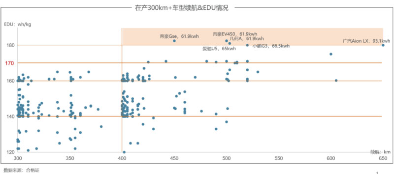 數(shù)據(jù)顯示,國(guó)內(nèi)在產(chǎn)的純電動(dòng)車型(300km+車型續(xù)航)中,普遍的動(dòng)力電池系統(tǒng)能量密度為140-160Wh/kg,少數(shù)車型達(dá)到170Wh/kg,極少數(shù)車型可達(dá)到180Wh/kg(其配套電量均>60kWh);而搭配孚能科技動(dòng)力電池的北汽EU5升級(jí)版(電池系統(tǒng)能量密度高達(dá)180.05Wh/kg)則成為當(dāng)下登上能量密度“珠峰”的極少數(shù)車型之一。