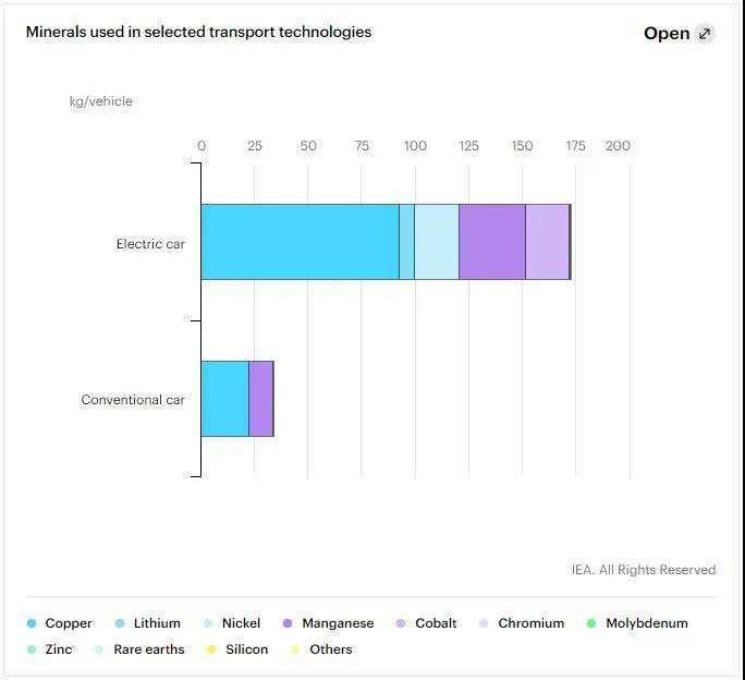 國(guó)際能源署介紹了鋰、鈷、鎳、銅、鉑和稀土等礦產(chǎn)的重要性,其中,鋰、鈷和鎳使電池具有較高的充電性能和能量密度,所以應(yīng)用廣泛;銅具有無(wú)可比擬的導(dǎo)電能力,因此在整個(gè)能源系統(tǒng)中,其對(duì)于不斷增加的用電必不可少;而一些稀土元素,如釹,可以產(chǎn)生強(qiáng)大的磁性,對(duì)于風(fēng)力渦輪機(jī)和電動(dòng)汽車至關(guān)重要。