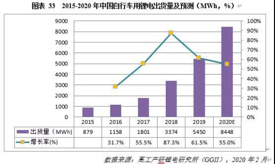 高工產(chǎn)研鋰電研究所(GGII)數(shù)據(jù)顯示,受下游需求強勢拉動,2019年中國自行車用鋰電池出貨量達(dá)5.450GWh,同比增長61.5%。預(yù)計2020年將提升至8.448GWh,同比增長55%。