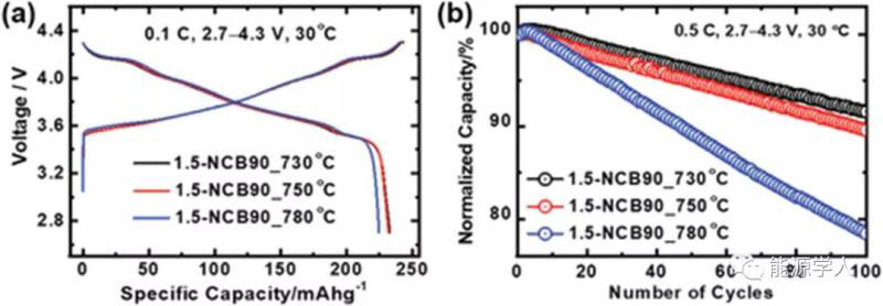 圖6:a)初始充放電曲線,b)在三個(gè)不同溫度下煅燒的1.5-NCB90正極的循環(huán)性能。