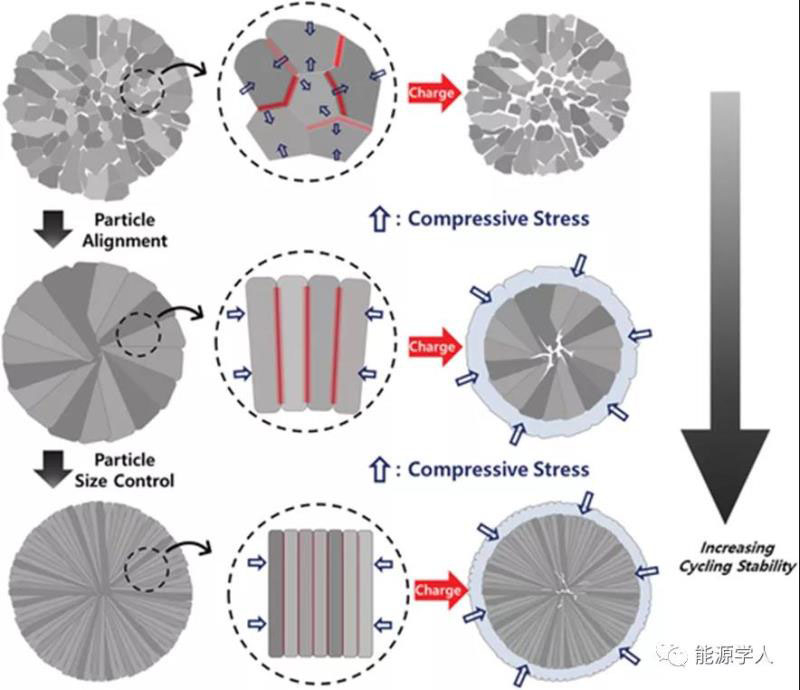 圖5:次級(jí)粒子由(上)隨機(jī)取向,(中)徑向取向和(下)尺寸進(jìn)一步細(xì)化的初級(jí)粒子。不同微觀結(jié)構(gòu),在充電過(guò)程中局部應(yīng)力集中和應(yīng)力分布會(huì)有所不同。