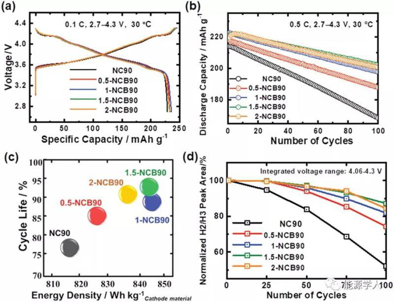 NC90正極的H2→H3峰面積與H2→H3相變期間的放電容量相對(duì)應(yīng)(圖4d),隨著循環(huán)的進(jìn)行而急劇下降,表明結(jié)構(gòu)退化,并隨著循環(huán)而增加極化。但是,隨著硼含量的增加,NCB正極的峰強(qiáng)度衰減相對(duì)較慢,這證實(shí)了H2?H3相變的優(yōu)異可逆性和結(jié)構(gòu)穩(wěn)定性。