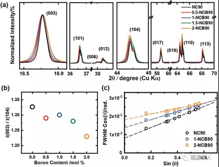 圖3:a)在四個(gè)不同區(qū)域的放大XRD,b)(003)/(104)強(qiáng)度比,c)NC90和NCB正極的Williamson-Hall圖。