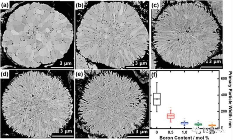 圖2:a)NC90,b)0.5-NCB90,c)1-NCB90,d)1.5-NCB90和e)2-NCB90正極顆粒的橫截面SEM圖像。f)NCB正極的一次顆粒直徑分布。