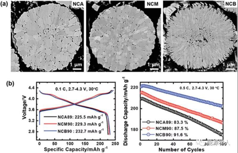 圖1:a)顆粒截面的SEM,b)常規(guī)NCA89和NCM90正極以及新型NCB正極的電化學(xué)性能。