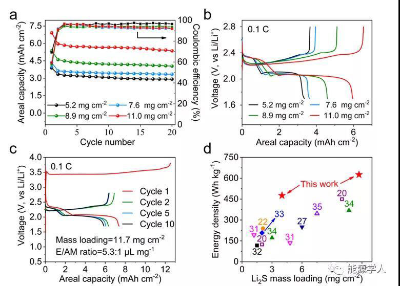 圖6.(a-b)Li2S||Au/Cu全電池的高載量循環(huán)性能及其充放電曲線;(c)Li2S||Au/Cu全電池在高載量,低電解液用量下的充放電曲線;(d)本工作與其他文獻(xiàn)報(bào)道的能量密度對比。