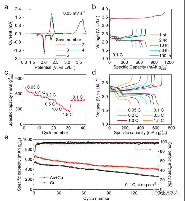 圖5.(a-d)Li2S||Au/Cu全電池的CV曲線、倍率性能及其相應(yīng)的充放電曲線;(e)Li2S||Au/Cu全電池和Li2S||Cu全電池長循環(huán)性能對比。