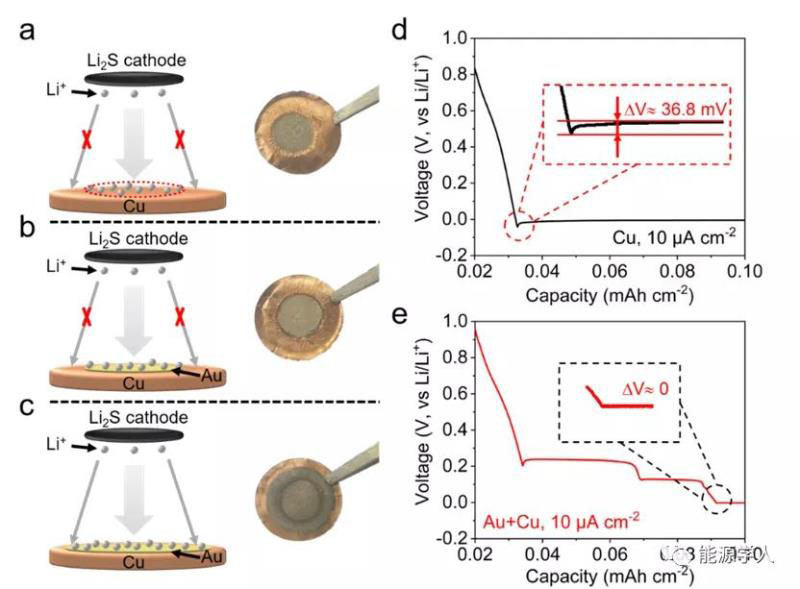 圖2.(a-c)Li2S||Cu,Li2S||8-Au/Cu和Li2S||12-Au/Cu全電池示意圖及其負(fù)極的光學(xué)照片;(d-e)Li||Cu、Li||Au/Cu電池的電壓-容量曲線。
