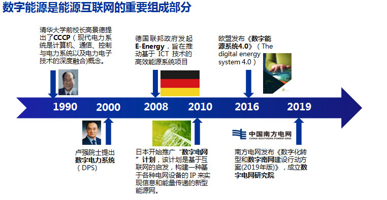 能源領(lǐng)域尤其是電力系統(tǒng)的數(shù)字化轉(zhuǎn)型至少已經(jīng)開展了30年,可以分為三個(gè)階段。第一是概念提出階段,在1990年清華大學(xué)前校長(zhǎng)高景德提出了CCCP(即現(xiàn)代電力系統(tǒng)是計(jì)算機(jī)、通信、控制與電力系統(tǒng)以及電力電子深度融合),在2000年清華大學(xué)盧強(qiáng)院士提出了“數(shù)字電力系統(tǒng)”(Digital Power System, DSP);第二是示范實(shí)踐階段,以2008年德國(guó)發(fā)起的“電子能源”(E-Energy)計(jì)劃與2010年日本發(fā)起的“數(shù)字電網(wǎng)”計(jì)劃為代表;第三是全面發(fā)展階段,2016年歐盟發(fā)布《數(shù)字能源系統(tǒng)4.0》,2019年南方電網(wǎng)有限公司發(fā)布《數(shù)字化轉(zhuǎn)型和數(shù)字南網(wǎng)建設(shè)行動(dòng)方案(2019年版)》并成立南方電網(wǎng)數(shù)字電網(wǎng)研究院。在這個(gè)階段,包括前述第一批倡議名單成員為代表的主要能源企業(yè),以及國(guó)家和地方能源主管部門,也都在其各自的政策和戰(zhàn)略文件中將數(shù)字化轉(zhuǎn)型作為重要方向。這一階段的能源數(shù)字化轉(zhuǎn)型體現(xiàn)出新的特征,即從服務(wù)能源企業(yè)與能源系統(tǒng)內(nèi)部的提質(zhì)增效,延伸到服務(wù)外部的產(chǎn)業(yè)賦能與治理支撐,這正是數(shù)字中國(guó)建設(shè)和數(shù)字經(jīng)濟(jì)發(fā)展的要求。