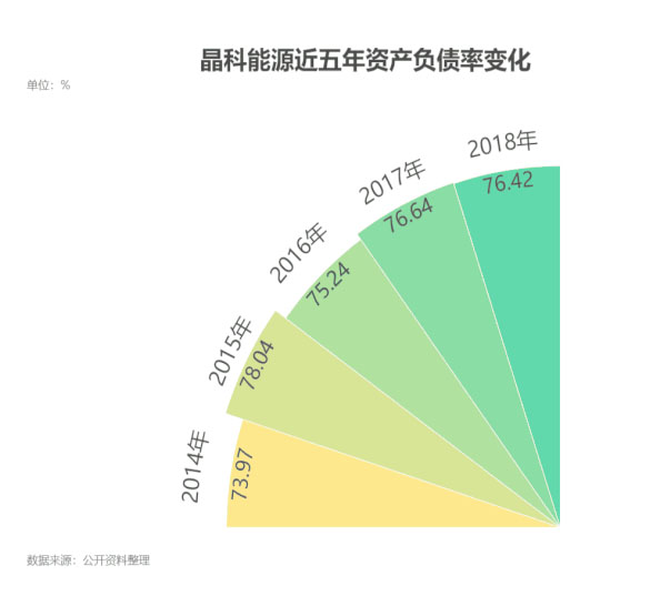 李仙德手上的另一張王牌晶科能源的負(fù)債同樣高企,2014-2018年,資產(chǎn)負(fù)債率一直保持在73%-78%。