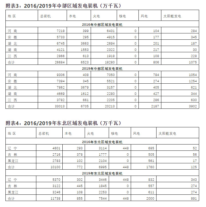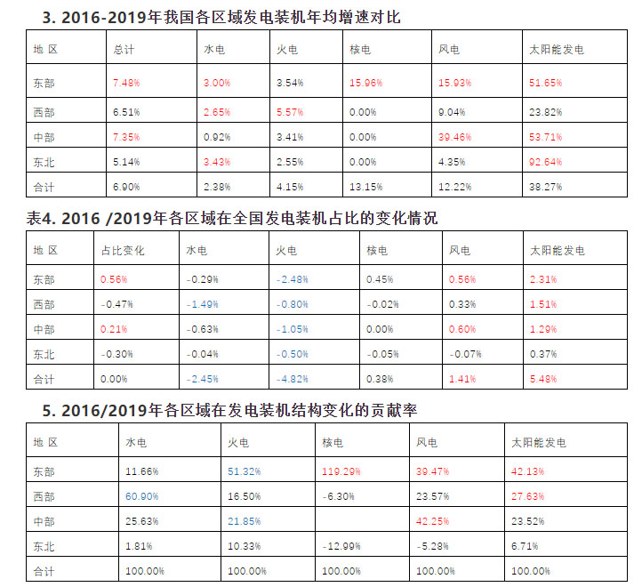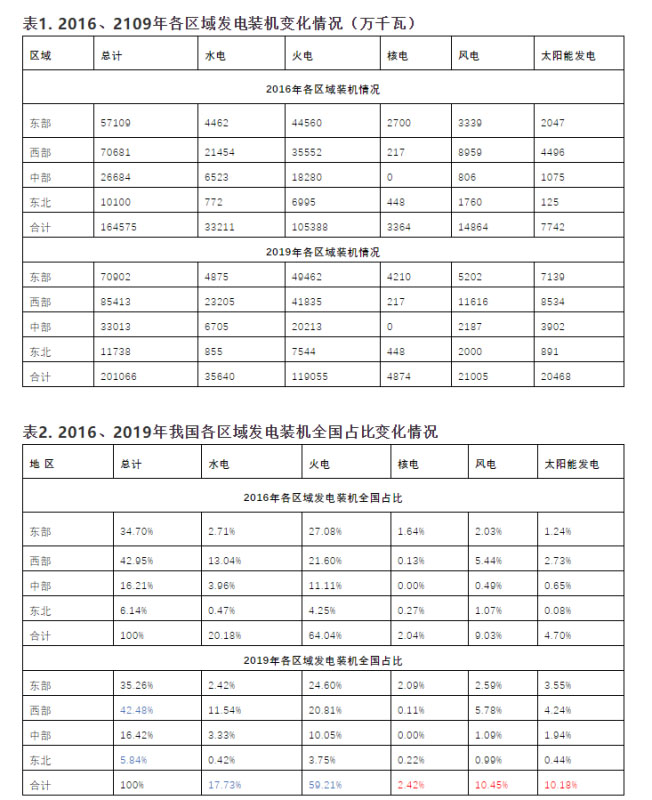 1、 從發(fā)電裝機(jī)全國占比看,與2016年相比,2019年各區(qū)域發(fā)電裝機(jī)在全國的占比變化不大,東部和中部占比略增,西部和東北略降。
