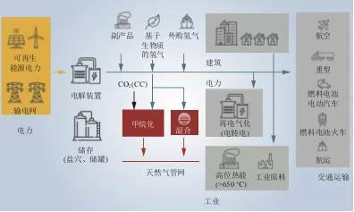 各個(gè)部門(mén)的電氣化路徑也并非彼此獨(dú)立,相反,任何一種技術(shù)路徑都可能對(duì)整個(gè)能源系統(tǒng)產(chǎn)生深遠(yuǎn)的影響,不同部門(mén)之間也會(huì)因此產(chǎn)生更為緊密的聯(lián)系,進(jìn)而形成相互耦合、相互影響的綜合能源系統(tǒng)。例如,電制氫及相關(guān)技術(shù)可為間接的可再生能源電氣化提供支撐,特別是對(duì)電氣化困難較大的行業(yè)產(chǎn)生重要影響,使終端用能部門(mén)的深度脫碳成為可能,如圖2所示。