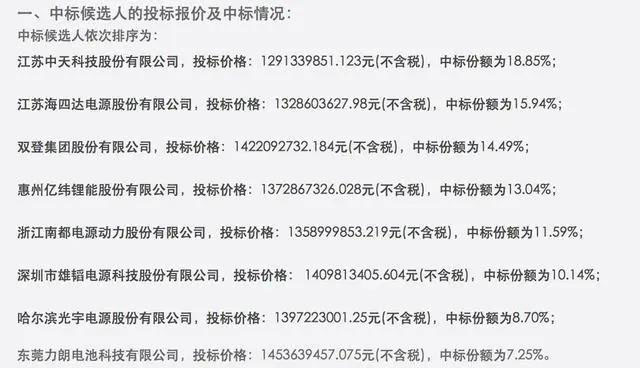 根據(jù)中國(guó)移動(dòng)日前發(fā)布的《2020年通信用磷酸鐵鋰電池產(chǎn)品集中采購(gòu)中標(biāo)候選人公示》,江蘇中天科技股份有限公司、江蘇海四達(dá)電源股份有限公司、雙登集團(tuán)股份有限公司、惠州億緯鋰能股份有限公司、浙江南都電源動(dòng)力股份有限公司、深圳市雄韜電源科技股份有限公司、哈爾濱光宇電源股份有限公司、東莞力朗電池科技有限公司等8家公司入圍,最多中標(biāo)份額為18.85%。