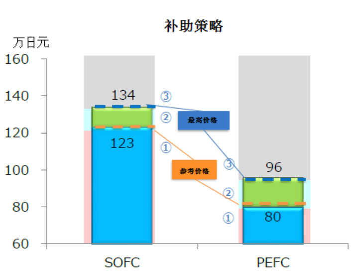補(bǔ)貼范圍:燃料電池設(shè)備和安裝費(fèi)用的總價(jià),1)低于參考價(jià)格(123萬日元,即73800人民幣):SOFC補(bǔ)助8萬日元(即4800元人民幣);2)高于參考價(jià)格而低于最高價(jià)格(134萬日元,即80400人民幣):SOFC補(bǔ)助4萬日元(即2400元人民幣);3)如果超過最高價(jià)格,不予補(bǔ)貼;4)PEFC(聚合物電解質(zhì)燃料電池)沒有統(tǒng)一補(bǔ)助標(biāo)準(zhǔn);5)另外,對可支持液化石油氣的設(shè)備、可應(yīng)用在寒冷地區(qū)、可用在公寓等環(huán)境中的FEMFC和SOFC進(jìn)行額外補(bǔ)貼。