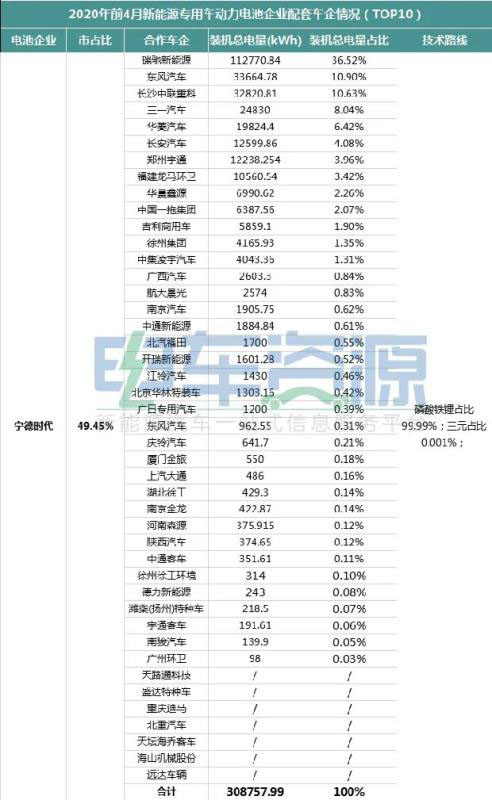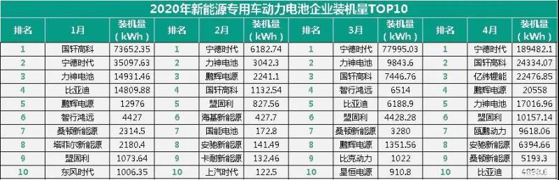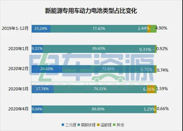 電車資源梳理了2020年1-4月新能源專用車動力電池裝機(jī)量的情況,簡要分析如下: