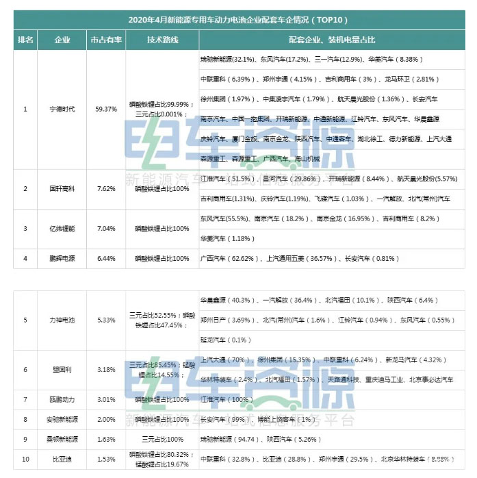 從專用車動力電池企業(yè)的配套情況來看,4月,寧德時代配套31家車企,在專用車的市場占有率高達(dá)59.37%,幾乎所有配套的車型均采用磷酸鐵鋰電池。