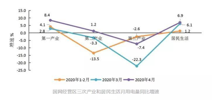 4月份,國家電網(wǎng)經(jīng)營區(qū)(下同)全社會用電量4354億千瓦時,同比增長0.7%,增速較3月份回升5.3個百分點。其中,三次產(chǎn)業(yè)和居民生活用電量同比增速分別為8.4%、1.2%、-7.4%和6.9%。第二產(chǎn)業(yè)用電量增速由負轉(zhuǎn)正,已恢復(fù)并超過去年同期水平;第三產(chǎn)業(yè)用電量降幅明顯收窄,表明社會經(jīng)濟活動正加快恢復(fù)。三次產(chǎn)業(yè)和居民生活用電增速環(huán)比分別回升5.6、4.5、14.8和0.8個百分點。