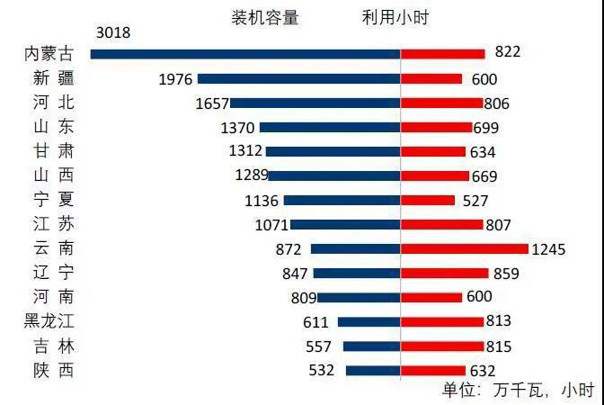 圖5 1-4月份風(fēng)電裝機(jī)較多省份風(fēng)電裝機(jī)容量和設(shè)備利用小時(shí)