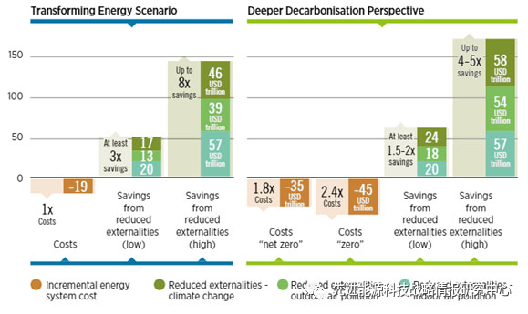 2、加快可再生能源部署和提高能效回報將遠(yuǎn)大于投入。按照“轉(zhuǎn)型能源情景”,能源轉(zhuǎn)型每花費(fèi)1美元,將獲得3-8美元的投資回報(圖5)。換言之,到2050年“轉(zhuǎn)型能源情景”將增加19萬億美元的成本,但通過降低環(huán)境和健康損害,將獲得50-142萬億美元的回報。要實(shí)現(xiàn)凈零排放,“更深度脫碳情景”將需再增加16萬億美元投入,如果實(shí)現(xiàn)完全無排放則將增加26萬億美元成本,但零碳排放帶來的收益將達(dá)到62-169萬億美元。另一種衡量成本的方法是在此期間減少一噸碳排放的成本。對于“轉(zhuǎn)型能源情景”,該成本為34美元/噸,對于“更深度脫碳情景”凈零排放,成本為100美元/噸,對于“更深度脫碳情景”完全零排放,成本為156美元/噸。