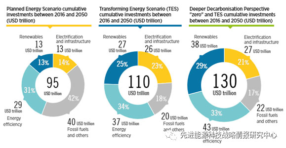 1、為了確保氣候安全,需要擴(kuò)大對清潔能源技術(shù)的投資并轉(zhuǎn)變投資方向。需要將化石燃料投資轉(zhuǎn)向可再生能源和能效,逐步取消化石燃料補(bǔ)貼。到2050年,“轉(zhuǎn)型能源情景”中能源系統(tǒng)總投資需要達(dá)到110萬億美元,約占同期年均GDP的2%。其中,超過80%的資金應(yīng)投資可再生能源、能效、終端用能電氣化以及電網(wǎng)和靈活性。如果以年度計(jì)算,每年的投資水平應(yīng)達(dá)到約3.2萬億美元。相比之下,2014-2018年期間平均每年的投資約為1.8萬億美元,而在“已規(guī)劃能源情景”下未來將達(dá)到2.9萬億美元/年。如果希望實(shí)現(xiàn)“零碳排放”,到2050年對能源系統(tǒng)總投資需要達(dá)到130萬億美元(見圖4)。