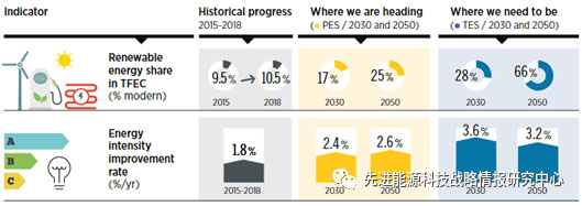 4、作為降低碳排放的主要解決方案,能效和可再生能源需加速部署。能效和可再生能源是實(shí)現(xiàn)全球能源轉(zhuǎn)型的兩個關(guān)鍵解決方案。然而,由于能源需求持續(xù)增長,2010年以來可再生能源在全球終端能源消費(fèi)中所占的份額僅在10%左右緩慢增長。2019年能源強(qiáng)度僅增長1.2%,低于過去十年的平均水平(1.8%)。按照“轉(zhuǎn)型能源情景”,可再生能源、能效和電氣化將共同貢獻(xiàn)90%的能源相關(guān)減排量,可再生能源在終端能源消費(fèi)占比到2030年應(yīng)增至28%,到2050年需達(dá)到66%,而能源強(qiáng)度改善速度需提高到每年3.2%,才能滿足全球氣候目標(biāo)(圖3)。
