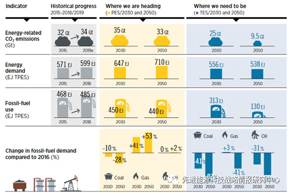 圖1 到2050年全球一次能源需求、化石燃料需求以及能源相關(guān)碳排放變化