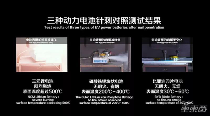 ▲比亞迪刀片電池和其他電池的針刺測試結(jié)果對比