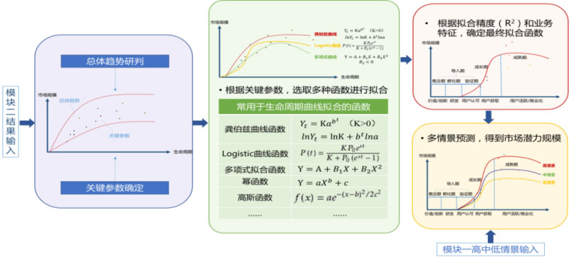 以模塊一的情景和模塊二的數(shù)據(jù)作為輸入,選擇多種函數(shù)進行擬合,根據(jù)擬合精度(R2)和業(yè)務特征,確定合適的生命周期曲線,進行多情景市場潛力測算。明確各業(yè)務在當前、2020、2025和2035年所處的發(fā)展階段及市場規(guī)模。